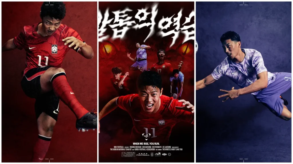 Le maillot domicile est en rouge « Global Red » avec des détails dorés — le retour de l’or sur le maillot principal depuis 2004. Le maillot extérieur est le plus audacieux de la collection Nike : violet profond et vert citron, contrasté par des touches de bleu vif. L’inspiration ? Le tigre coréen, symbole de puissance et de surprise.