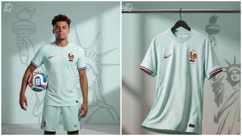 Le maillot des Bleus est un hommage à la Statue de la Liberté, cadeau de la France aux États-Unis en 1886 — un clin d’œil parfait pour un Mondial américain. Le domicile combine un bleu « Game Royal » avec des accents cuivre métallique évoquant la patine du monument. Le motif all-over reprend les initiales FFF. Le maillot extérieur, en vert menthe et cuivre, est plus audacieux et inattendu.